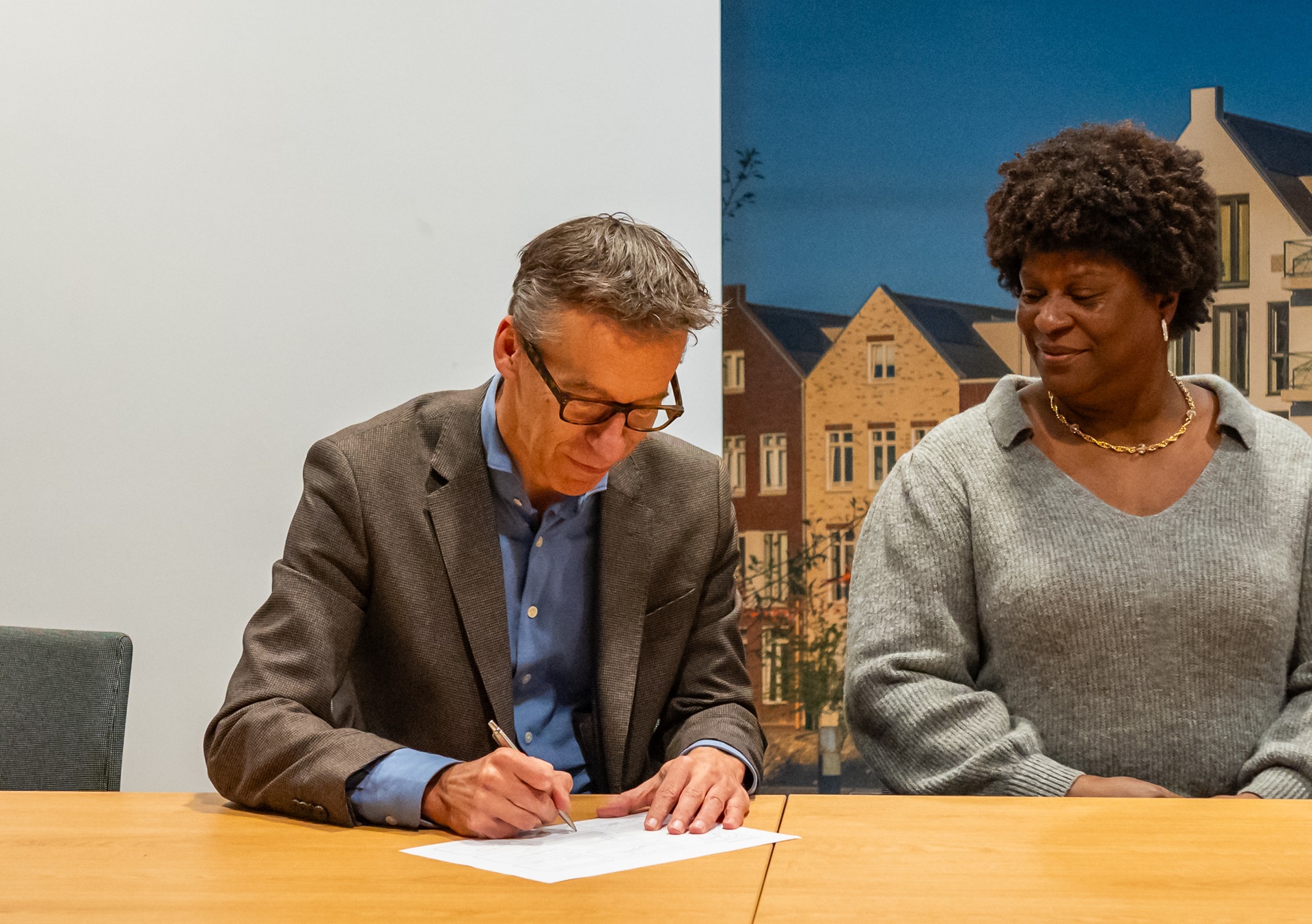 Directeur André Hammink (Woonbron) en Angela de Jongh Blijd, voorzitter van Bewonersvereniging De Samenwerking, ondertekenden de prestatieafspraken voor Woonbron.