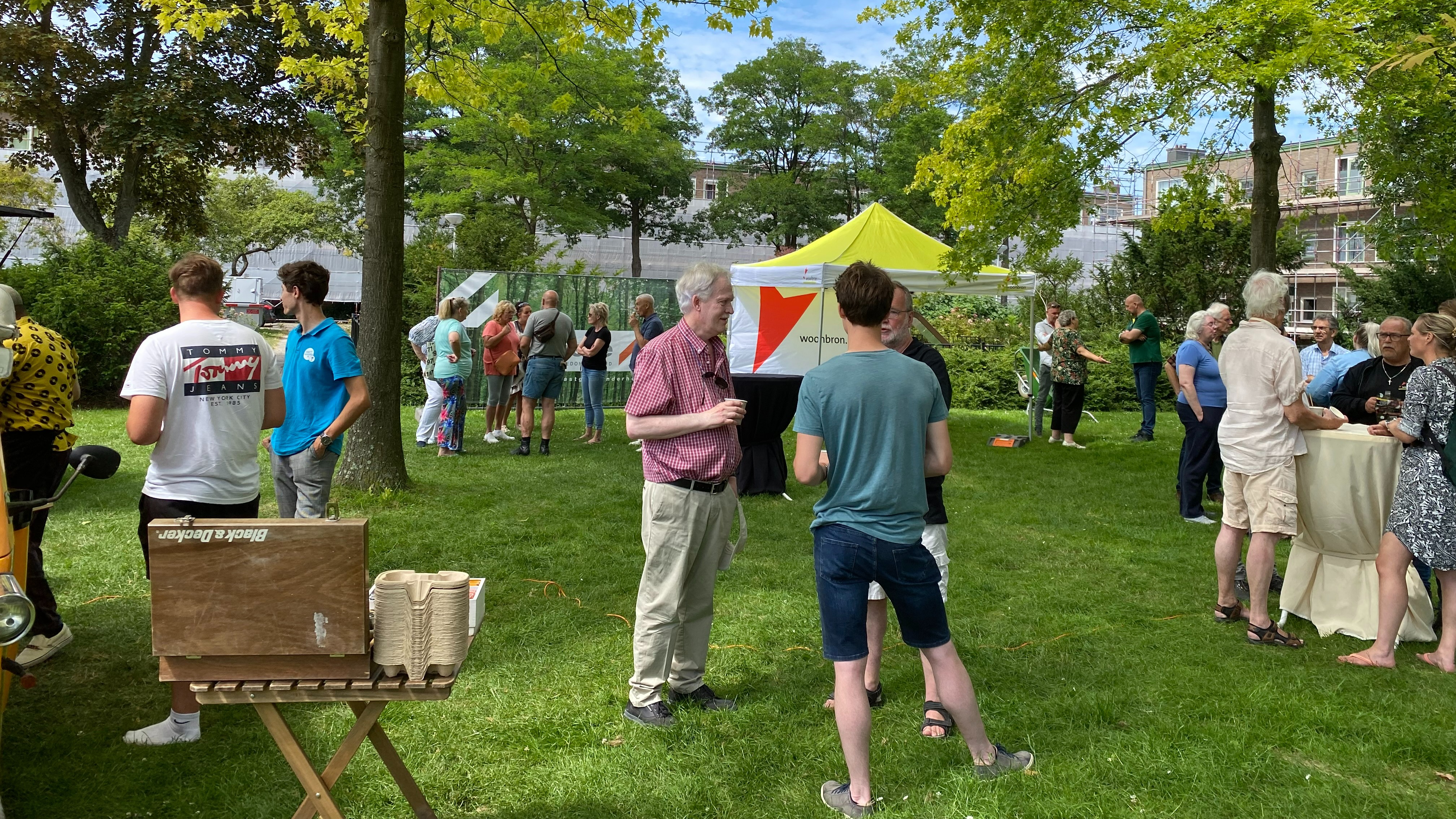 Het grasveld aan de Schrobbelaarstraat was 13 juli dé plek voor ontmoeting. Buurtbewoners, medewerkers van Woonbron en vaklieden van De Goede Vastgoedonderhoud raakten met elkaar in gesprek. Onder het genot van een hapje en een drankje deelden zij alle ervaringen met elkaar. Bij sommige bewoners zijn alle werkzaamheden al uitgevoerd, bij anderen komt de aannemer na de bouwvakantie nog over de vloer. Hoewel bewoners in de koude maanden gaan ervaren of het nieuwe isolerende glas voor een aangenamer binnenklimaat zorgt, zijn ze nu al razend enthousiast: "Wij wonen dichtbij de kazerne. De sirenes van uitrukkende hulpdiensten horen we dag en nacht. Door het nieuwe glas horen we niets meer van deze storende buitengeluiden in onze woning. Heerlijk! Ook de voorzitter van de bewonerscommissie, de heer Meeuwsen, is tevreden: "De aannemer doet wat hij zegt en dat is fijn. Als de steigers eenmaal weg zijn, zie je de buurt opknappen. En dat niet alleen. Door de isolatie en de mechanische ventilatie wonen we een stuk behaaglijker."