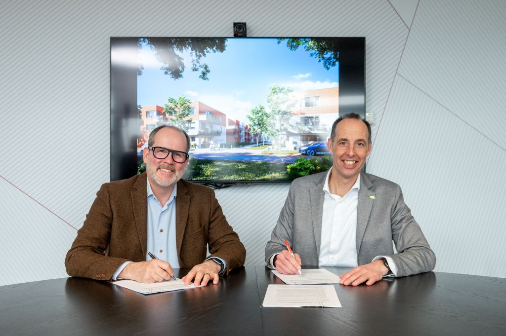 Ondertekening van de aanneemovereenkomst Witte Dorp door Tomas Schütz (l), manager Vastgoedontwikkeling & Realisatie bij Woonbron en Martin de Jong, vestigingsdirecteur bij Van Wijnen Dordrecht.