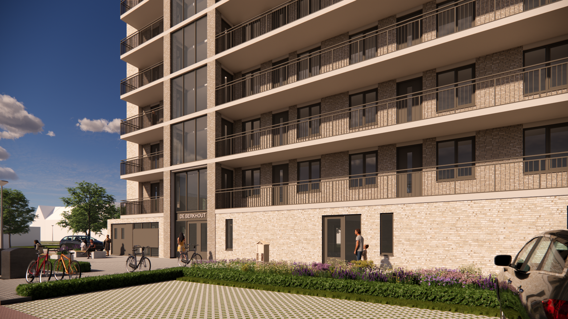 Op de begane grond komen 4 appartementen, die grenzen aan het plantsoen. Bij de overige appartementen op de verdiepingen bevinden slaapkamers en balkons zich straks aan de westkant. Dit doen we op advies van de GGD, omdat de drukke Prinses Beatrixlaan veel geluid en fijnstof produceert. We realiseren zogenaamde leefgalerijen, waarbij galerij en balkons gecombineerd worden. De woonkamers komen op het oosten en krijgen een Frans balkon met openslaande deuren.
