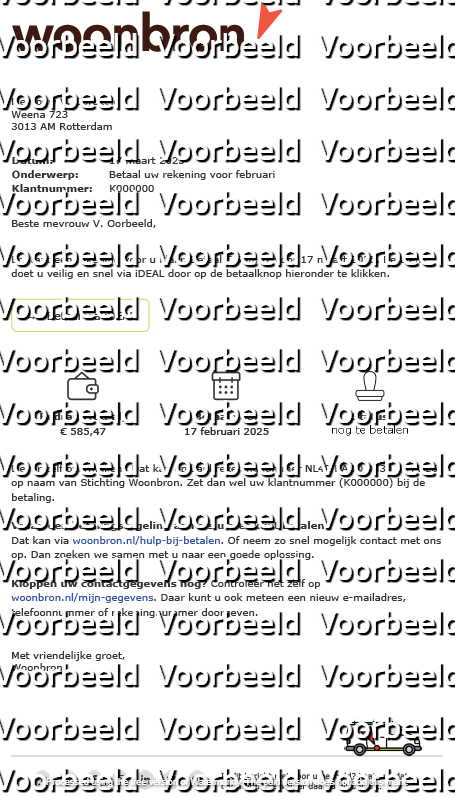 Je krijgt vanaf april 2025 een betaalverzoek van woonbron@mind2pay.com. De betaalknop gaat naar transactie.betaalspot.nl. Bekijk hier een voorbeeld van dit betaalverzoek. Woonbron is de afzender van dit bericht.